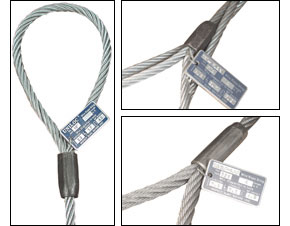 In addition we have developed a vinyl tag system. For the most popular sling- and tie-down sizes we have pre-printed tags with large legible capacity information and important safety precautions. The wire rope sling tags are spliced into the sling eye and can not “ride” onto the sling body; they will remain in the protected “crotch” area of the sling loop.