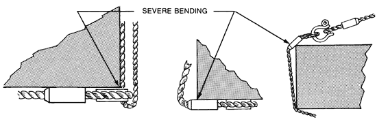 Do not place the splice sleeves, rope thimbles, or sling hooks around corners. A sleeve failure under these condition will result in the failure of the sling and you WILL drop the load. Check the sleeves regularly for nicks and cracks. Rope sleeves are NOT designed to be hooked under loads and be used as a swaged button; rope sleeves secure the rope ends and are not intended to lift the load.