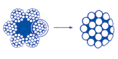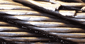 Worn and abraided wiresWear, due to friction on sheaves, rollers, drums, etc., eventually causes outer wire abrasion. Before any inspection is made, determine what type of wire rope you have in service. Many of today’s wire ropes are ‘compacted’, ‘calibrated’, or ‘die formed’. This manufacturing process purposely flattens the outer wires and for an inexperienced inspector these ropes may appear to be already abraded when indeed they are brand new. If you are in doubt about what type of rope you are about to inspect, have a look at a section of the rope which was not subjected to any abrasive work; e.g. like the safety wraps on the drum or a section just behind the end connection. The round outer wires of standard wire rope will become flat on the outside due to friction when in contact with drums, sheaves, or other abrasive matter like sand or gravel. This is part of normal service deterioration and in most crane installations relatively even abrasion will occur. The rope must be replaced, however, if this wear exceeds 1/3 of the diameter of the wire. It is good practice to compare a section of the rope which was NOT subjected to any bending work (e.g. the safety wraps, or a short section behind the end fitting) to the rope section to be inspected. The same applies when evaluating any possible reduced rope diameter during service. (See next column.) |