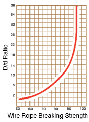 Loss of Strength over Sheaves and PinsRope breaking strength is determined in a standard test wherein fittings are attached to the ends of the rope and the rope is pulled in a straight line. If however, the rope passes over a curved surface (such as a sheave or pin) its strength is decreased. The amount of such reduction will depend on the severity of the bend as expressed by the D/d ratio. For example, a rope bent around a pin of its own diameter will have only 50% of the strength attributed to it in the standard test. This is called ‘50% efficiency’. Even at D/d ratios of 40, there may be a loss of up to 5%. At smaller D/d ratios, the loss in strength increases quite rapidly. The angle of bend needs not to be 180°, 90°, or even 45°; relatively small bends can cause considerable loss. The table shown derived from standard test data as published by the ‘Wire Rope Technical Board’, is based on static loads only, and is a weighted average of 458 tests over pins and thimbles on 6×19 and 6×37 class ropes. |