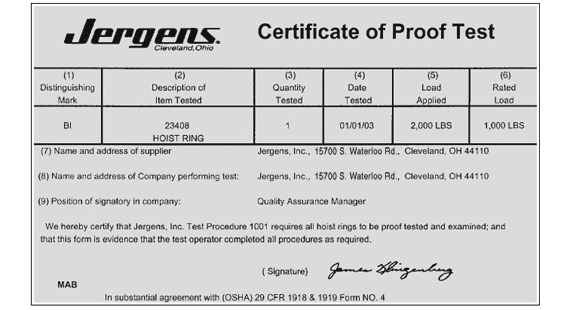 - Proof load testing, magnafluxing, heat treating and material certification are on file at Jergens, Inc.