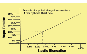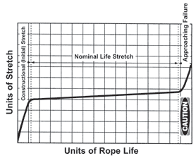 Rope StretchConstructional Stretch This stretch occurs in three phases: 1) Initial or constructional stretch during the early period (Run-In) of rope service, caused by the rope adjusting to the operating conditions. 2) Following the run-in period there there is a extended period – the longest part of the ropes’s service life – during which a slight increase in stretch takes place over an extended time. This results from normal wear, fatigue etc. On a graph this portion would almost be a horizontal straight line inclined slightly upward from its initial level. 3) Thereafter, the stretch occurs at a quicker rate. This means that the rope has reached the point of rapid degradation; a result of prolonged subjection to abrasive wear, fatigue, and inner undetected wire breaks, etc. This second upturn of the curve is a warning indicating that the rope should be removed to avoid sudden catastrophic rope failures. |