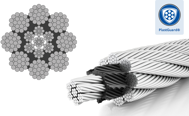 8-strand high performance overhead crane wire rope with a plastic coated core. This special engineered hard plastic prevents metal to metal contact between outer- and inner strands and greatly reduces internal, non-detectable, wear and abrasion resulting in increased fatigue life, plus it provides for permanent core lubrication. This rope is not compacted.