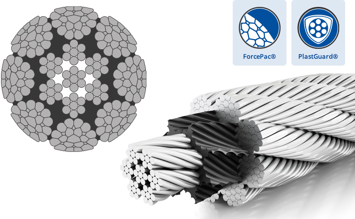 8-strand high performance with a plastic coated core. This special engineered hard plastic prevents metal to metal contact between outer- and inner strands and greatly reduces internal, non-detectable, wear and abrasion resulting in increased fatigue life.