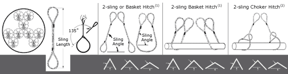 The minimum bending radius (D/d ratio) for the sling eye is 1:1 where “D” is the pin or load and “d” is the sling body.
