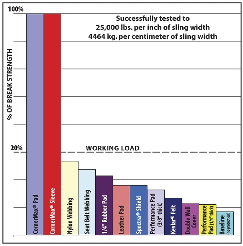 The CornerMax™ Sleeve is the latest in rigging protection from SLINGMAX® Rigging Solutions. The CornerMax™ Sleeve is the ideal solution to protect synthetic slings from cutting when it is not practical to use a CornerMax™ Pad (due to curvature of the load edge). Independent field and laboratory testing has shown the CornerMax™ Sleeve to be extremely cut resistant. The CornerMax™ Sleeve is made from Dyneema® Fiber. To prevent sliding, the 6˝ wide CornerMax™ Sleeve has been sewn down the middle (5˝) on each end of the Twin-Path® Extra Sling (pictured). The true benefits of this revolutionary material far outweigh the costs and now provide for the use of synthetic slings in applications previously dominated by heavy chain, mesh and wire rope slings. Maximum loading is 25,000 lbs per sling inch of sling width. |