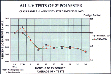 The ‘Web Sling and Tie-Down Association’ conducted two long time exposure test study on the degradation effects of polyester- and nylon web sling when exposed to sunlight. The first test was done in 1981, and the second test series was done between 1997 to 2004. The full test report is published by WSTDA, a copy of which can be obtained by Unirope. One of the main conclusions reached by WSTDA: "The polyester samples tended to undergo most of their strength loss during the first twelve months of exposure and then leveled off approximately a 30% loss in strength. The nylon 6 and nylon 6.6 sample showed a general trend of consistent strength loss over the entire 36 months exposure period, with strength loss levels approaching fifty to sixty percent after 36 months for some sample tests." Based on the test results and conclusions reached, Unirope has decided to discontinue the use of NYLON webbing material for Boat Lifting Slings. However, it must be noted that, although Polyester webbing seems less affected, even polyester slings will undergo a significant strength loss leading to a DECREASE in strength. Consequently, the DESIGN FACTOR for such slings will DROP from a 5:1 value to at least a value of 4:1! |