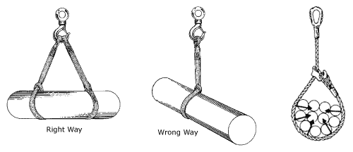 Extra care should be taken when using slings in a basket hitch to balance the load to prevent slippage. It is not good rigging practice to use one sling only in a simple basket hitch. If practical, take a full wrap around the load to grip it firmly. |