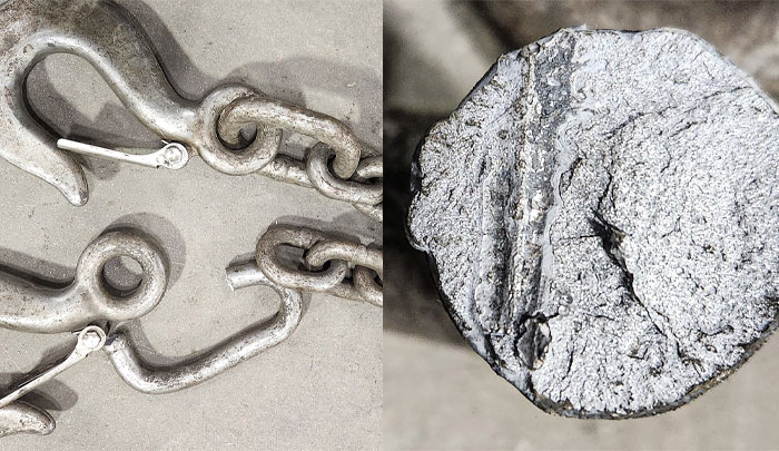 The importance of proof testing after a visual inspection. Above is a picture of a 1inch diameter 2-leg Gr 80 chain sling where a welded link was used to connect the eye to the sling hook. The welded link broke and stretched just below the 94,000 lbs. Proof Load. Looks like a crack in the weld not visible to the naked eyes made the link to break. That’s why we use factory welded chains and mechanical couplers to avoid custom shop welding of chain links. ALL of our chain slings, brand new or used, are proof tested to meet the AWRF Recommended “Guideline (RP&G) for Proof Test of Chain Slings”. The Test certificates are digitally available anywhere and at any time. For all your chain sling inspections and recertifications contact UNIROPE® Alberta-Ontario-Quebec.