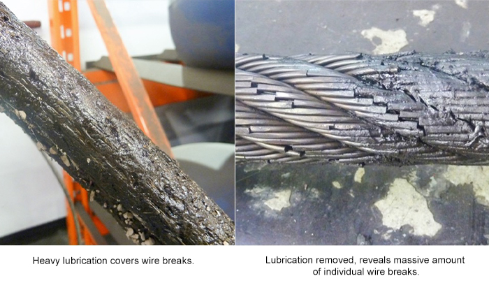 During manufacturing, wire rope is lubricated to reduce internal and external frictions. Tests performed by the University of Stuttgart, Germany, have shown that non-lubricated ropes will only last 1/3 of well lubricated ones. It is important to select the correct lubrication because thick and heavy lubes will just cover the outside of the rope without penetrating to the inside. In fact, thick lube will be locking-in moisture, accelerating internal corrosion. The result will be that visual rope inspections may not detect outside and inner (valley) breaks because thick lubricant will hide them. If you have to inspect thick-lubed wire rope you must remove the lube in regular intervals to perform proper inspections.